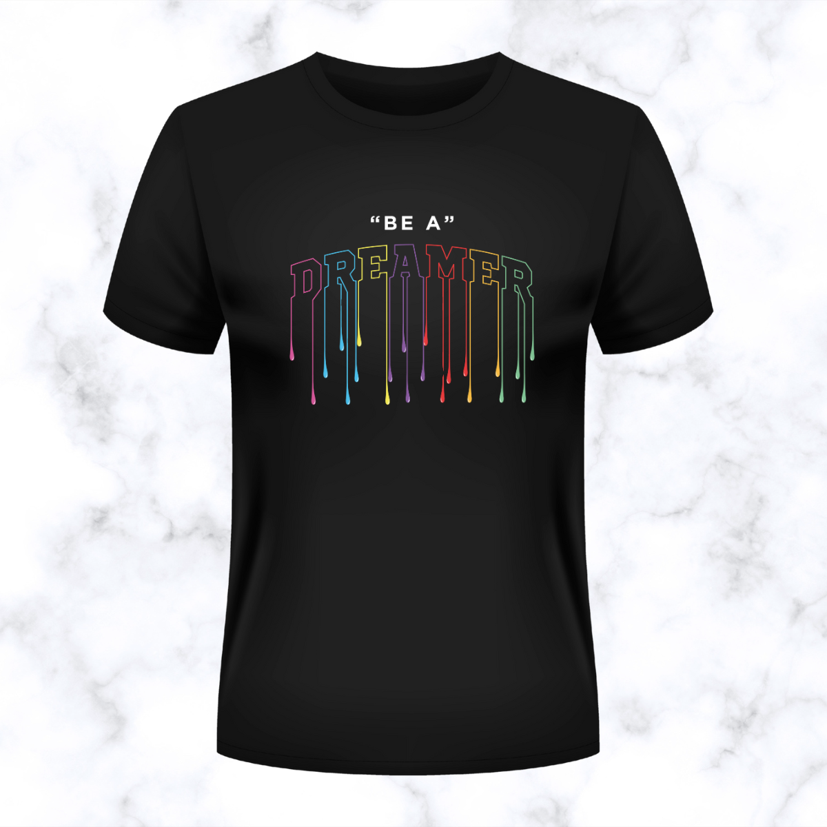 "be a dreamer" rainbow drip lettering black t shirt“Be A Dreamer” Rainbow Drip Lettering Black T-Shirt