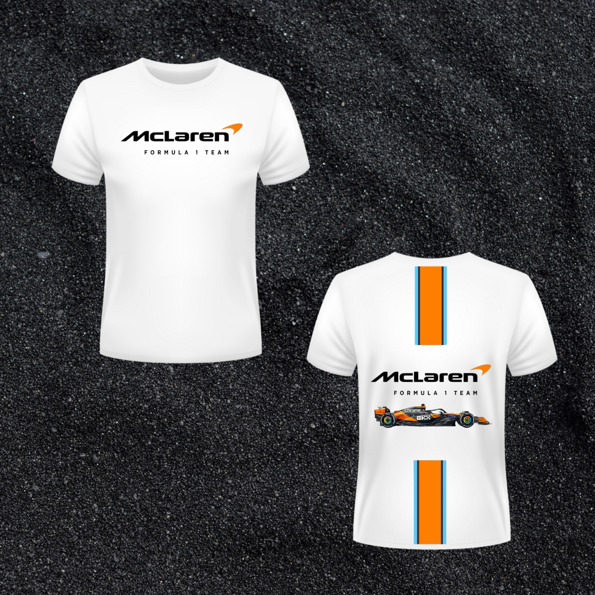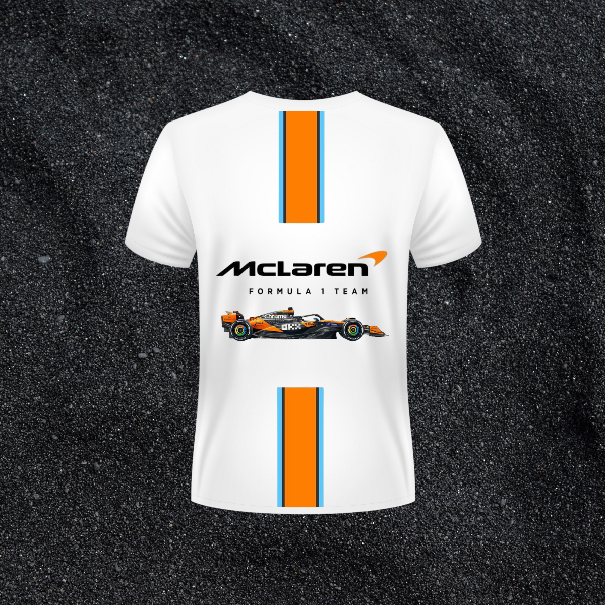 The front features the McLaren logo, while the back displays the papaya-striped racing theme along with the team’s F1 car artwork.