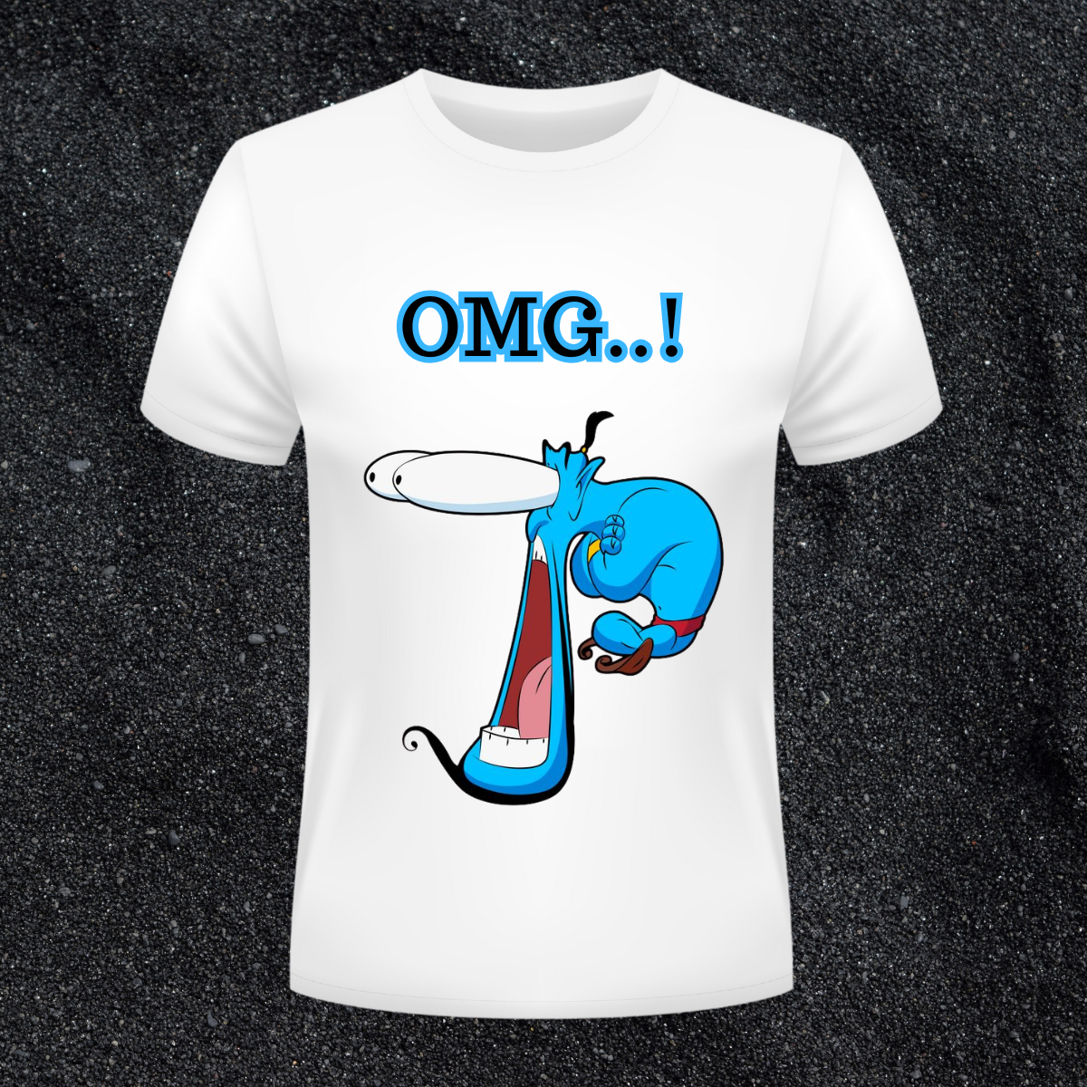 A hilarious and expressive tee featuring a blue genie in a state of shock, shouting “OMG..!” with a wide-open mouth. Perfect for fans of animated comedy and fun, conversation-starting apparel.