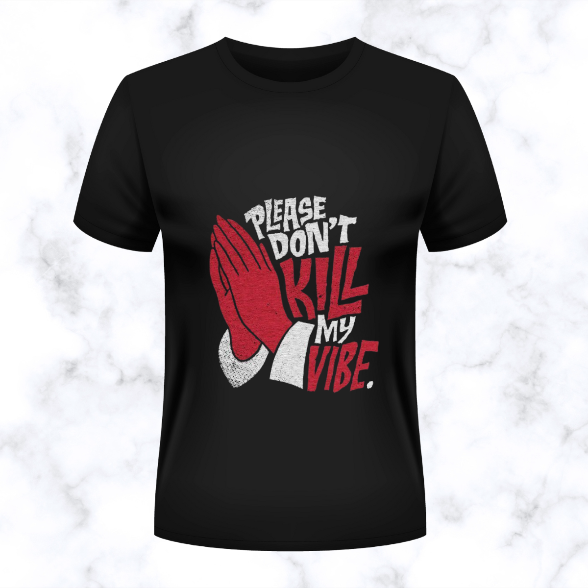Make a bold and peaceful statement with this black tee featuring the graphic phrase “Please Don’t Kill My Vibe” and a set of praying hands. A cool, streetwear design with a clear message about maintaining positive energy.