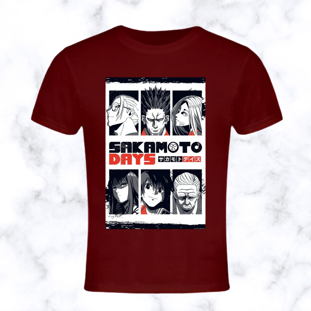 Description:- Feature the entire crew with this striking graphic t-shirt showcasing a grid of the main characters from the thrilling Sakamoto Days series. A fantastic piece for dedicated fans who love character-focused designs.